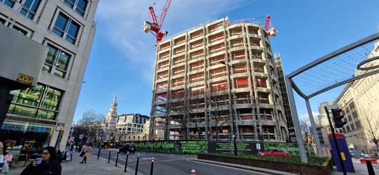 The Newgate Street site under development in January 2023, with Christchurch Greyfriars in the background. The photo shows the east half of the former GPO building stripped back to its retained concrete core, with the west side fully demolished in the area where the PCA excavation was undertaken (looking north-west)