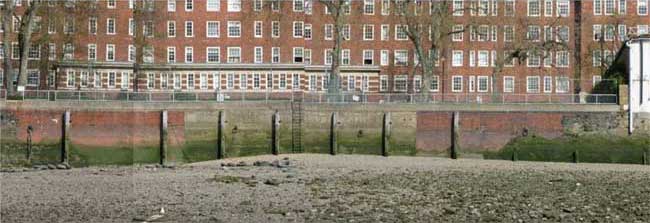 But archaeologists working on the Thames foreshore and in the London Metropolitan Archives have researched and revealed one of the many aspects of his remarkable work: his Thames Flood Emergency Repairs unit, a team he set up to deal with breaches in London’s river defences caused by the Luftwaffe’s high explosive bombs. Members of Thames Discovery Programme community archaeology project first stumbled upon surviving evidence of this work some 60 years later, while observing localised repairs to the river wall, sometimes in brick, more often in shuttered concrete.